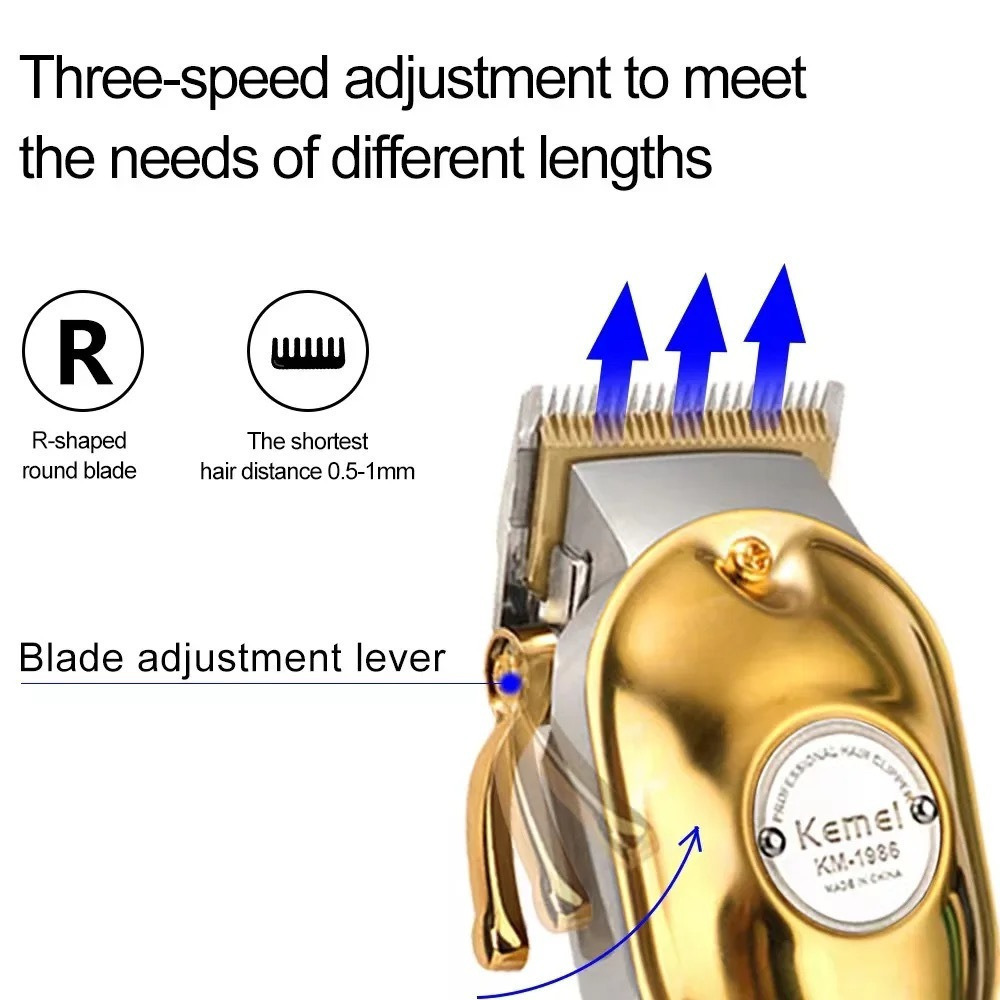 Máquina de Cortar Cabelo Barba Profissional Kemei KM 1986 com visor digital que mostra a carga da bateria.